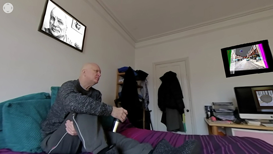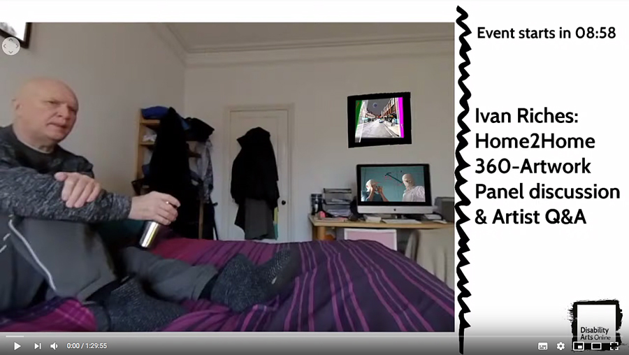 'Home2Home' is an immersive 360-degree online installation/artwork. It visually centres around the artist Ivan Riches experiences of living through lockdown. Its soundtrack consists of 6 disabled artist’s descriptions of their lockdown and how they strive to continue being creative.