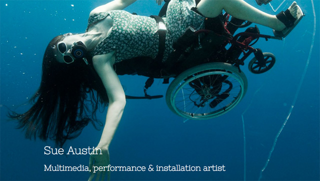 Sue Austin is a multimedia, performance and installation artist. Over an extended period of time her practice has operated as a vehicle to open up a thinking space around the materiality of the wheelchair. This is being used as a metaphor to raise questions about the value of diversity to society through raising the profile of 'difference'.